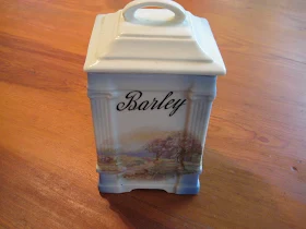 You know the canister sets you see in the antique stores? The sets of 4 or 6 or 8 or even 12, or more. There's always a canister for flour, and for sugar, and sometimes one rice, and ocassionally, for barley. Since Barley is our last name, it's a fun thing to hunt for. Sometimes the antique dealers will gladly break up a set and sell just the Barley jar. Sometimes though, they won't and they won't budge.